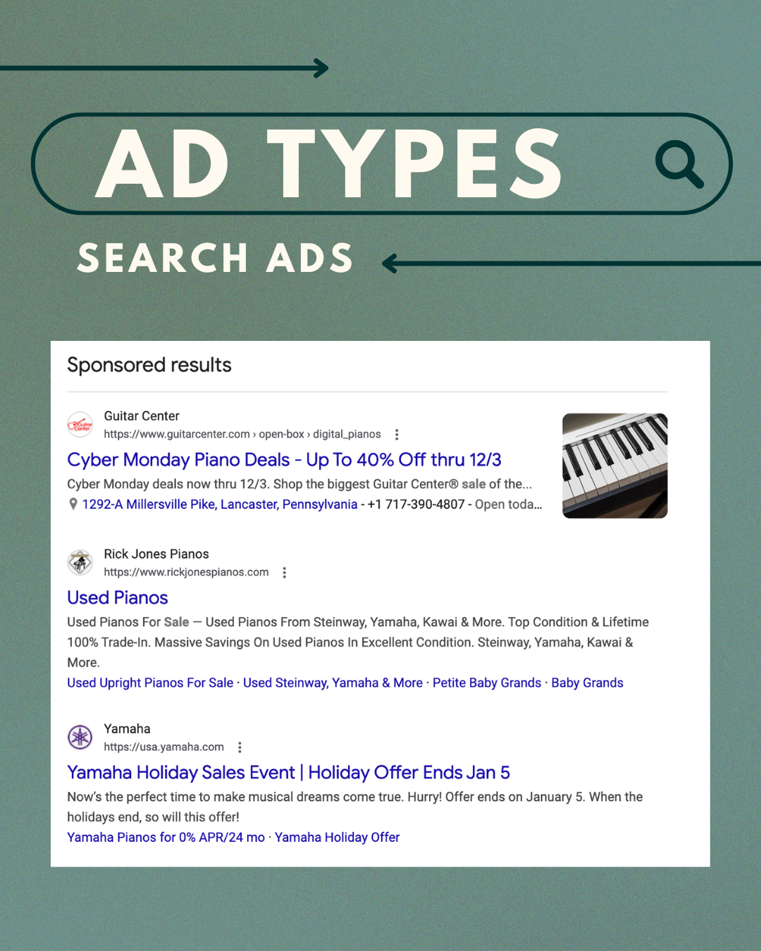 - Search Ads: Text ads appear when someone is actively searching for your services.